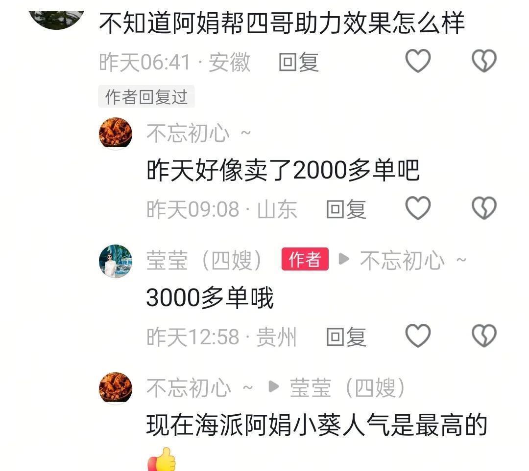 没想到沉淀了许久之后,老四还是把小奎和阿娟找去了,没想到在直播间突然爆单了,很多网友没有想到,但是我是确信的,我的视频和文贴里,早就说过100%会爆单,有网友说他们只有1000多单,其实并不准确,根据老四他们报出来的数量,已经超过了3000多单。