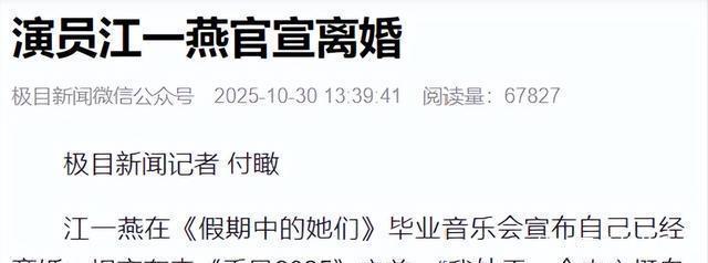 但谁能想到,再次出现,她就向观众扔了一个大瓜。 几天前,在综艺《假期中的她们》录制现场,久未发声的江一燕平静道出自己刚离婚一事。 “来节目之前,我刚把离婚手续办完”。