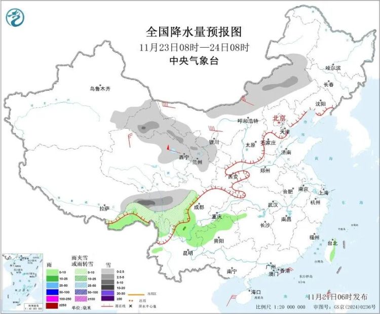 11月23日8时至24日8时,内蒙古中东部、西藏东部、青海北部、甘肃大部、川西高原中南部等地部分地区有小到中雪或雨夹雪。其中,西藏东北部等地部分地区有大雪。四川盆地西南部、云南东北部、贵州北部等地部分地区有小雨。内蒙古西部、青海西部等地部分地区有4至6级风,阵风7至8级;巴士海峡、南海北部和中东部海域将有5至7级、阵风8级的东北风,台湾海峡、台湾以东洋面、北部湾、南海中西部和西南部海域将有4至6级、阵风7级的东北风。